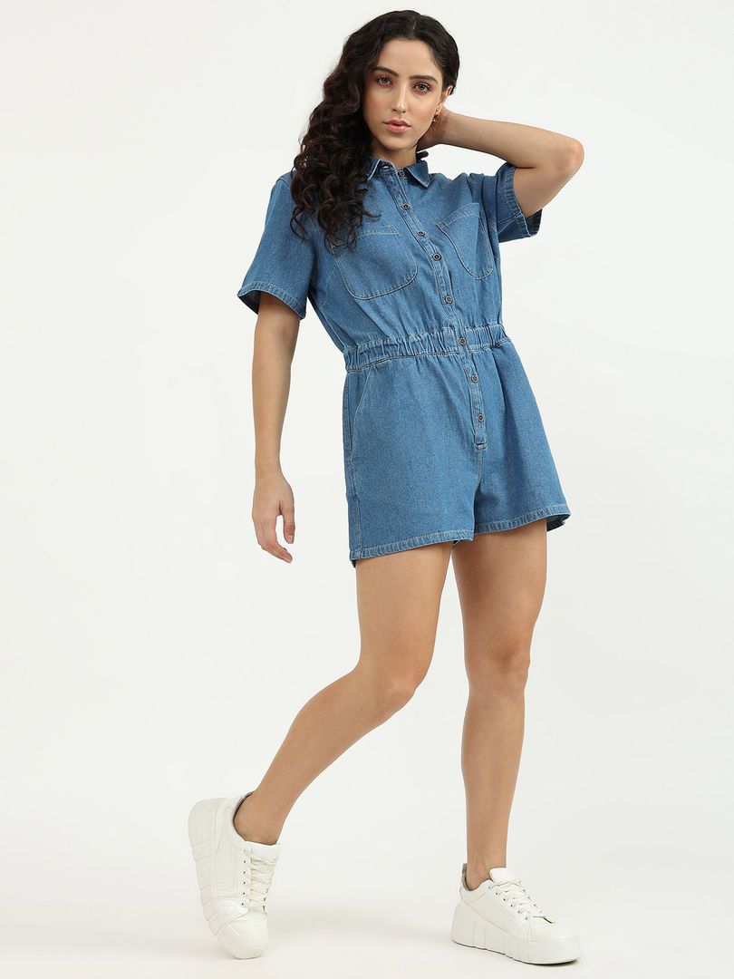 Description : Embrace comfort and style with this sky blue denim romper. Designed with a classic shirt silhouette on the top, it has a button closure and a rouched waist for a more defined fit. These are crafted from a 100% pure cotton fabric and have a regular fit. Pair with colorful sneakers and rock every event you go to.