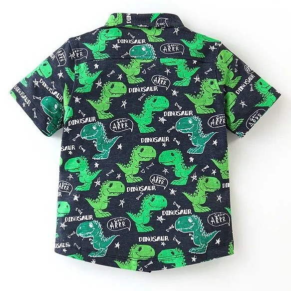 Add some prehistoric fun to your wardrobe with this Navy Blue Cotton Half Sleeve Shirt featuring a playful Dino Print. Made from soft and breathable cotton, this shirt is perfect for casual outings or lounging at home. The unique design is sure to make you stand out in a crowd while staying comfortable all day long.