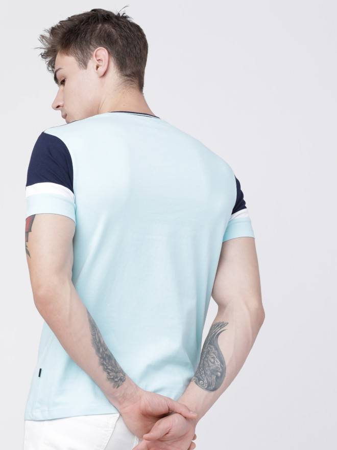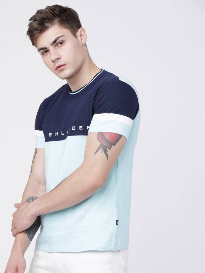 Size & Fit: Slim Fit Fabric: Cotton Fit: Slim Fit Colour: Blue Sleeve Length: Short Sleeves Neck: Round NeckLength: Regular Print or Pattern Type: Typography StyleCode: HLTS001533 Manufacturing: Made in India