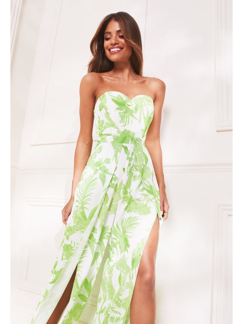 Description : Lipsy green floral split front jumpsuit. Tailored to sartorial perfection from premium quality fabric, it assures a soft and soothing touch against the skin. The exquisite silhouette adds to its appeal.