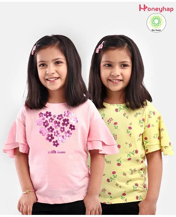 Stay comfortable and stylish all day long with our Honeyhap Cotton Half Sleeves T-Shirt Pack of 2 in vibrant Yellow & Pink. Made from soft and breathable cotton, these shirts are perfect for everyday wear. The half sleeves and classic crew neck make them versatile additions to your wardrobe. Whether you're running errands or hanging out with friends, you'll love the relaxed fit and trendy colors of these shirts. Upgrade your casual look with this must-have pack of 2 shirts!