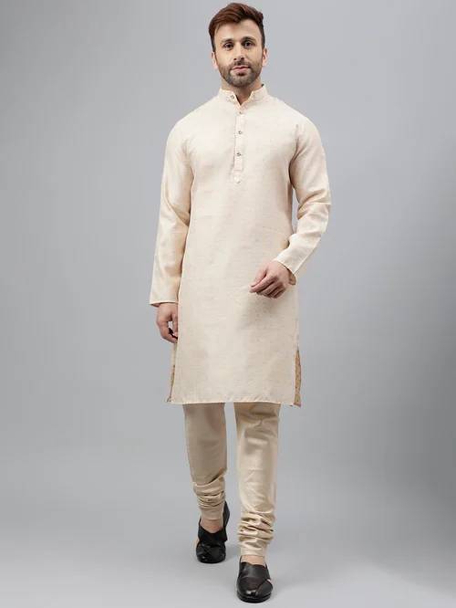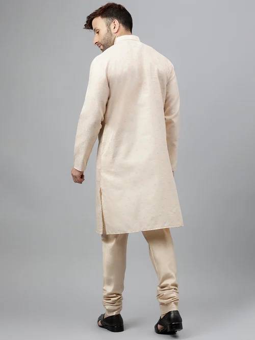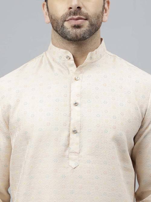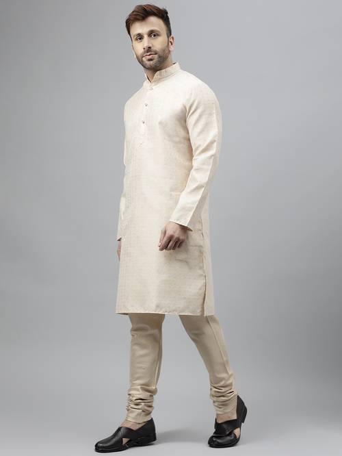 Dress up in absolute style for any festivity with this delightful light pink mandarin collar kurta and churidar set from the latest collection of Hangup. Artfully tailored in superior quality polyester viscose for natural sheen and a soft, light feel made complete by a nice drape and excellent comfort, it's classic regular fit cut and pleasing jacquard pattern make it a natural choice for many a festivity. Pair it with a leather mojris to complete the ensemble.
