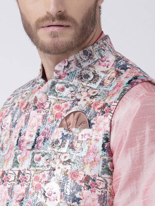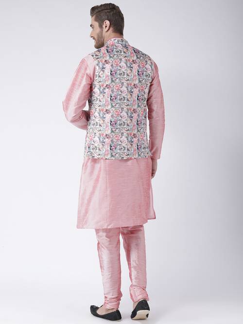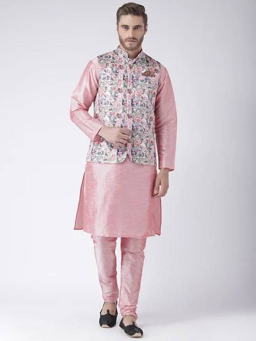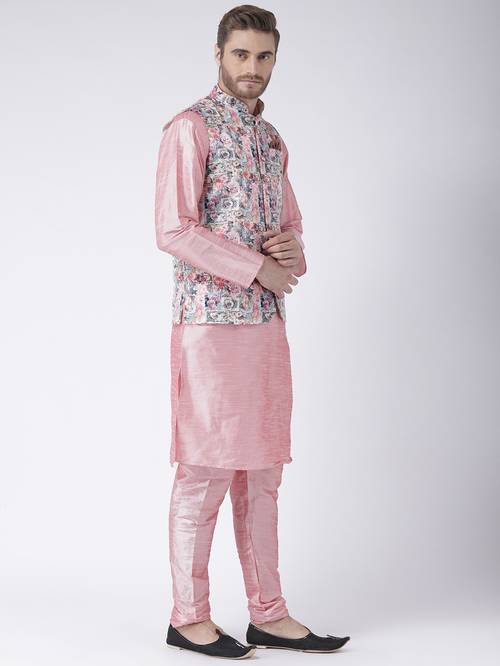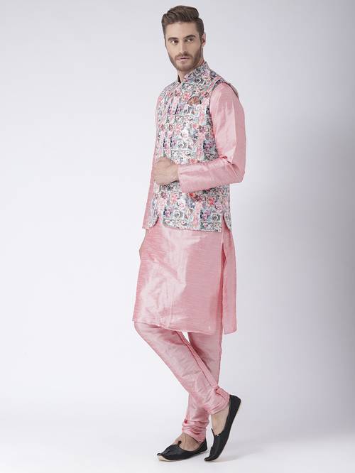 Make the vibrant evenings of the new season memorable with this awesome pink mandarin collar kurta and churidar set with Nehru jacket from the latest collection of Hangup Plus. Artfully tailored in fine polyester viscose for natural richness and lustre, beautiful drape, a soft, smooth hand feel and excellent comfort, it's classic regular fit cut and intricate color-block pattern are bound to make you stand out. Pair it with contrast colored mojris for a stunning look.