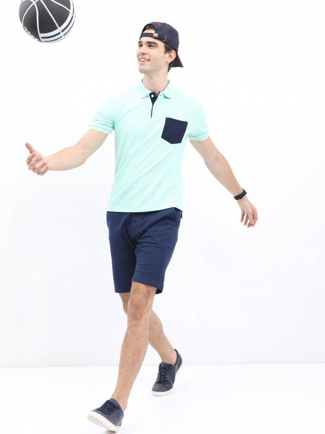 Style NoteComplete your look with sea green solid polo collar T shirt and pair it up with contrasting navy blue shorts .Accessories with loafers, wrist watch and a cap to give a sporty / outing look.
