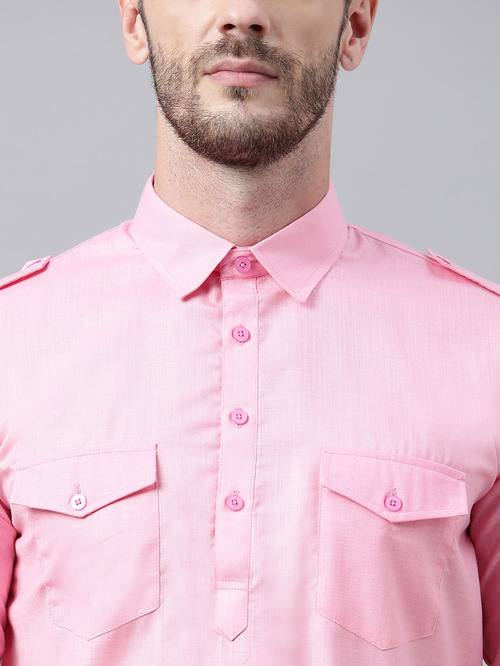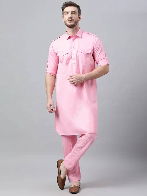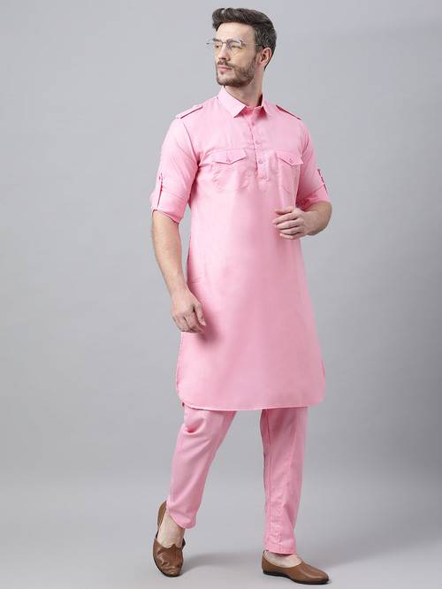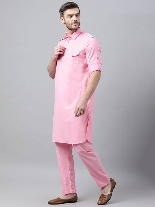 Acquire an ethnic and striking look by wearing this pink pathani kurta with pyjamas from Hangup. This dupion high quality pathani kurta with pyjamas features full sleeves kurta to amp up its charm. This regular fit kurta comes with a shirt collar and pink pyjamas pant. Team this pathani kurta with pyjamas with kolhapuris.