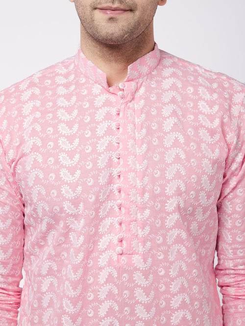 Prepare to welcome the festivities of the season with fresh fashion hues in this beautiful pink & white kurta & pyjamas set from the latest collection of VASTRAMAY. Artfully tailored in superior quality cotton for natural lustre and a nice drape coupled with a soft feel and excellent comfort, it's classic regular fit cut and versatile embroidered pattern are bound to add elegance to any occasion. Pair it with a contrast Nehru jacket to enhance it's flair.