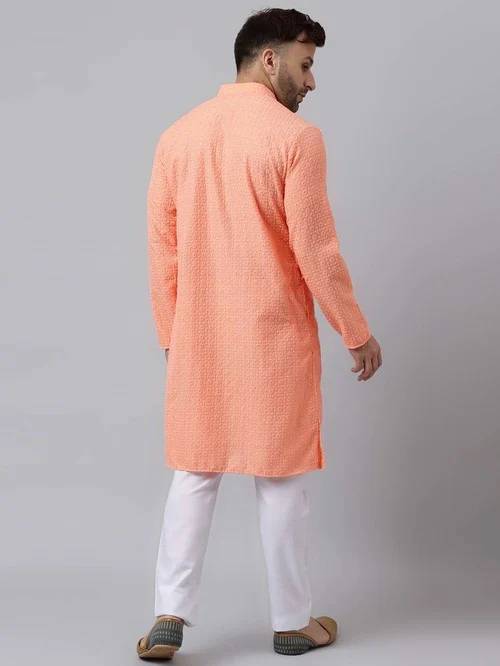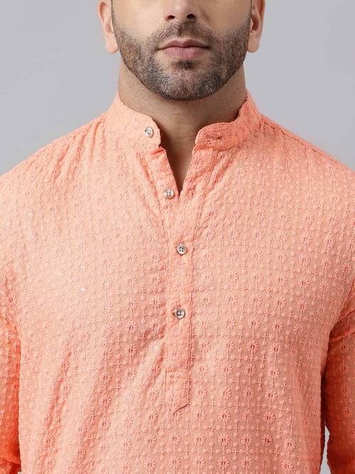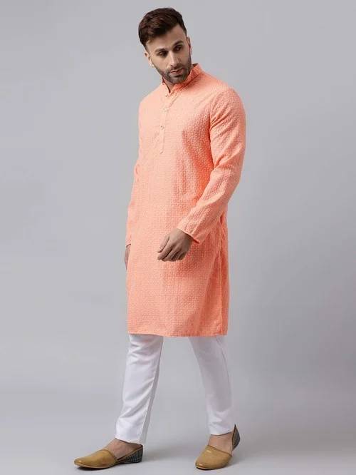 Dress up in absolute style for any festivity with this delightful peach & white mandarin collar kurta and pyjamas set from the latest collection of Hangup. Artfully tailored in superior quality viscose cotton for natural sheen and a soft, light feel made complete by a nice drape and excellent comfort, it's classic regular fit cut and pleasing embroidered pattern make it a natural choice for many a festivity. Pair it with a leather mojris to complete the ensemble.