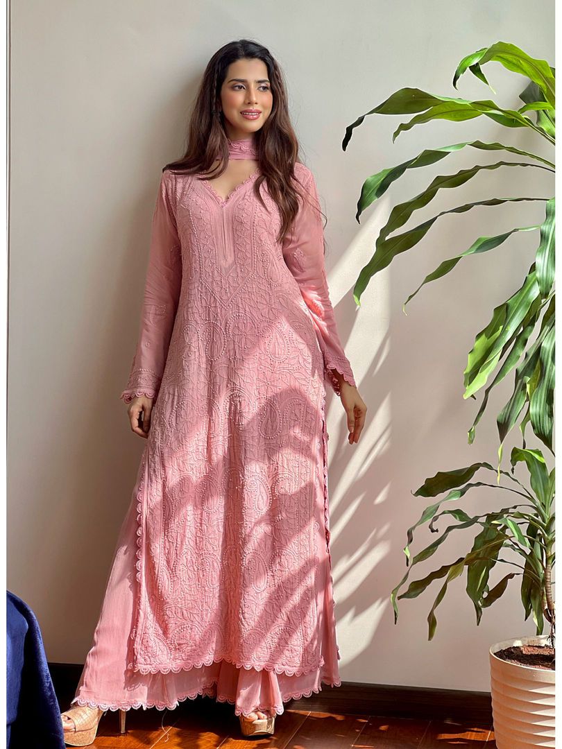 Description : Express your flare for ethnicity in style with the Rosanne Chikankari Palazzo Set. This set comprises of an embroidered kurta designed with intricate patterns, a smartly cut palazzo, and a soft chiffon dupatta laced beautifully at the borders. The intricate embroidery on the kurta adds a touch of sophistication to the entire ensemble, making it perfectly suited for any occasion – be it a party, a family gathering, or a day out with friends. Prepare to stun people as you don this elegant Palazzo Set! Meticulously crafted by skilled artisans, this masterpiece exemplifies handwork artistry. Expect slight design and color variations that enhance its individuality and allure