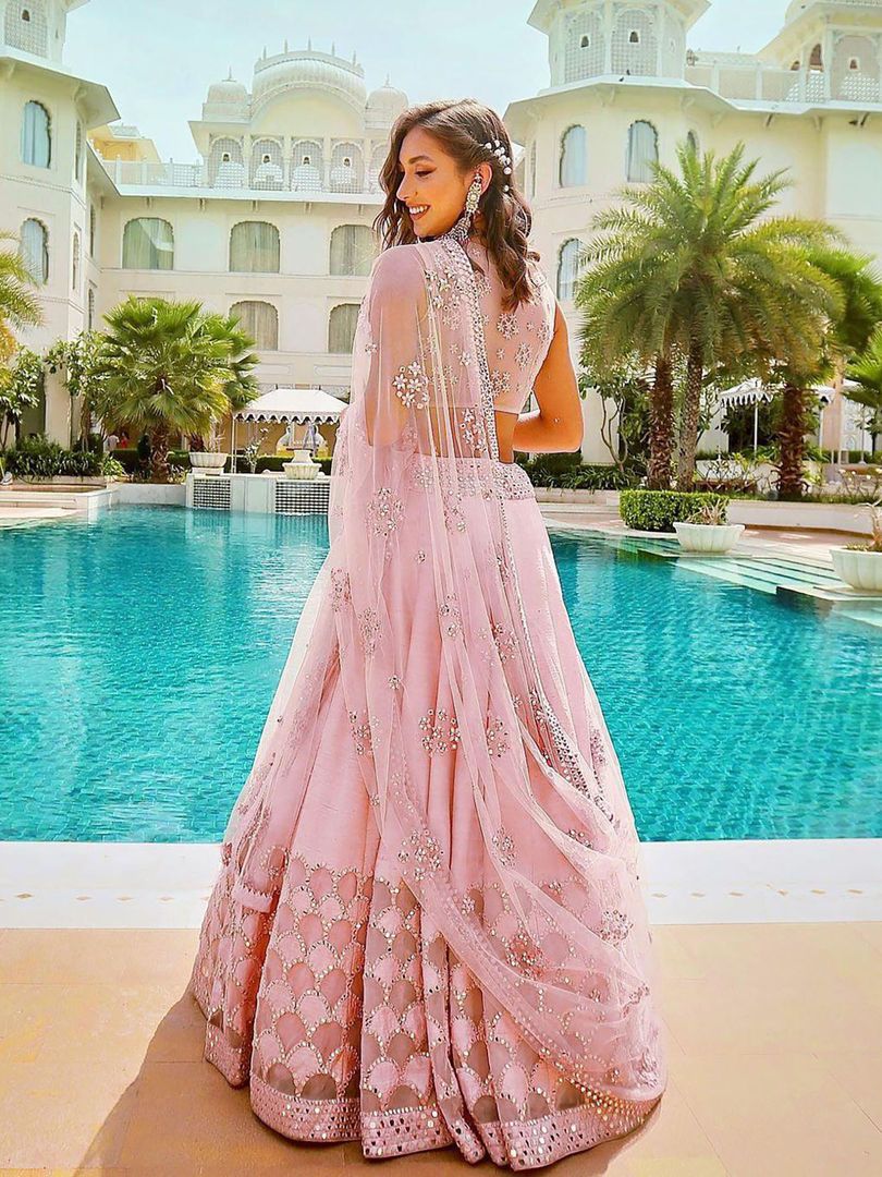 Description : To look beautiful this wedding season, grab this lovely lehenga, blouse and dupatta set. This lehenga set is fabricated on georgette and is beautified with embroidery. The lehenga has a bridal look. Pair it with matching jewellery, heels and a big smile for the gorgeous look.